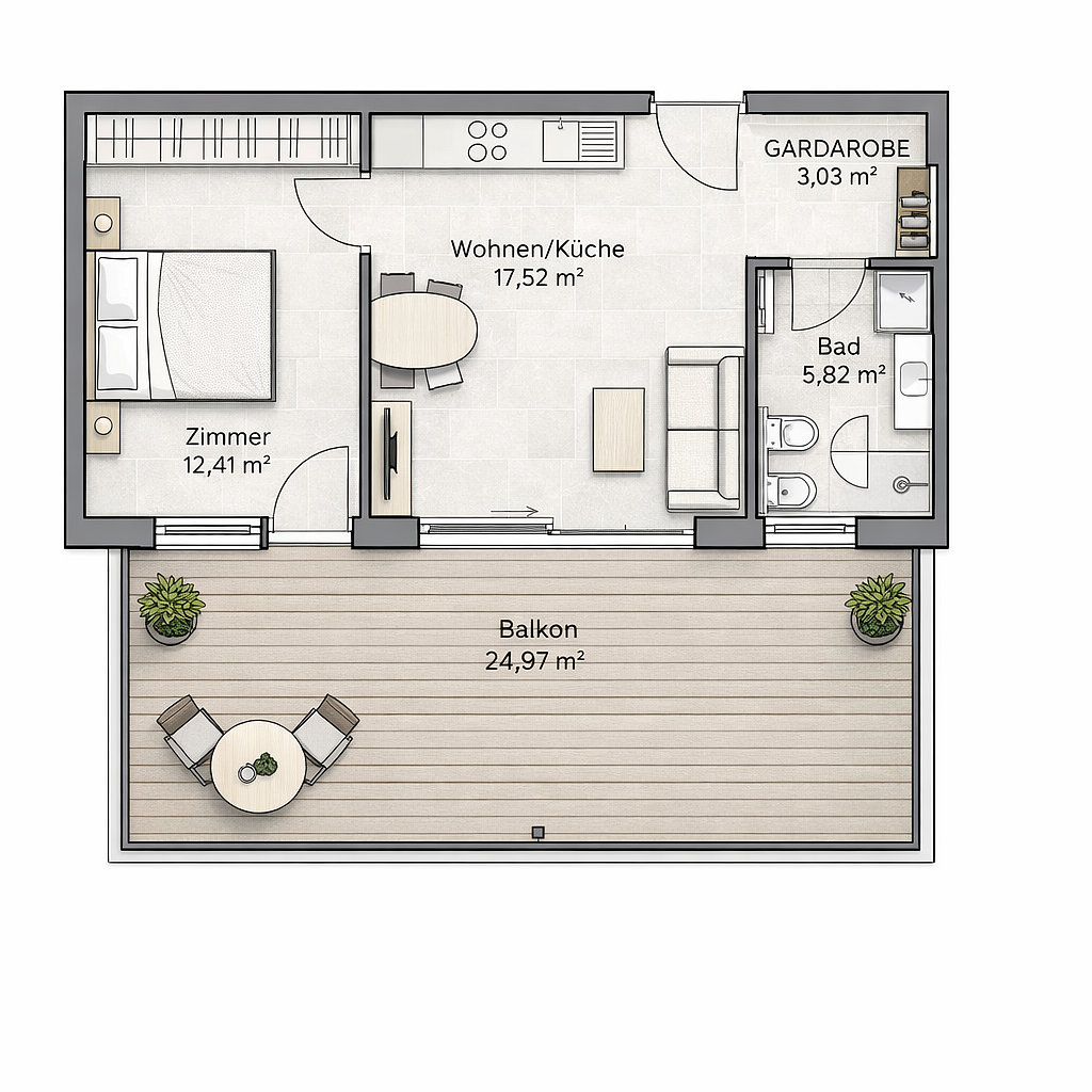 Die Wohnung erstreckt sich aus einem Wohnzimmer mit integrierter Küchenzeile, einem separaten Schlafzimmer und einem Badezimmer. Ein besonderes Highlight ist die großzügige Terrasse mit ca. 22 m², die zusätzlichen Wohnkomfort im Freien bietet. Die Haupträume sind nach Südosten ausgerichtet und profitieren dadurch von viel Tageslicht. Die Wohnung ist vollmöbliert.