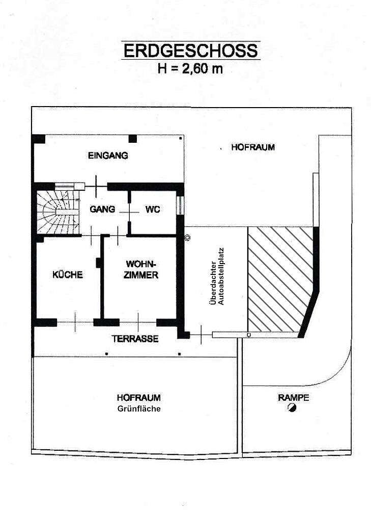 Già all’arrivo colpisce positivamente l’ampio accesso carrabile comune al garage. L’immobile dispone di un ampio garage doppio di circa 40m² netti, dotato di due portoni sezionali elettrici, completamente piastrellato e con accesso diretto all’interno della casa. Inoltre, è disponibile un posto auto coperto all’esterno. L’ingresso conduce al piano terra, dove si trovano un bagno, una cucina separata e una luminosa zona giorno con accesso alla terrazza soleggiata (ca. 15m²) e al curato giardino. L’area verde misura circa 53m² e invita a rilassarsi all’aperto.